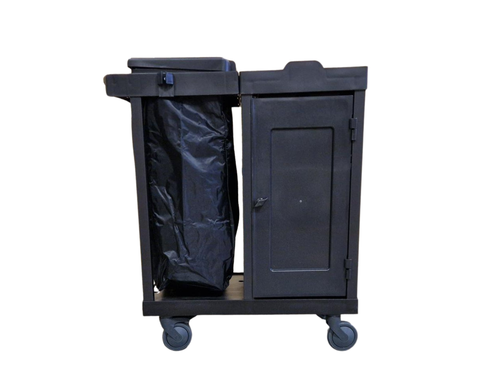 Rengjøringsvogn med dører for de fleste oppdrag. Dørene og den gode plassen gjør det lett å frakte med papir og såpe. Papiret ligger beskyttet og vognen ser presentabel ut. Solid utførelse med 4 bøtter for oppbevaring av kluter, utstyr eller rengjøringsløsninger. Utvendig sekk med glidelås for søppelsekker. En hylle med plass for papir, mopper og annet utstyr. Feste for moppeskaft og hengere for annet utstyr. Stort tilvalg av ekstra utstyr kan kjøpes til. 125 mm hjul med parkeringsbrems på 2 av hjulene.